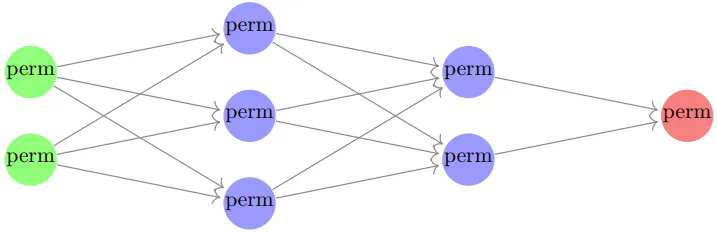 (这里,绿色、蓝色和红色点分别表示输入、隐藏层和输出层,perm 表示一个置换表示,它们并不一定相等。和普通的原始神经网络一样,这里也假设始终会有一个固定的激活函数,其会在每个隐藏层中被逐个应用到分量上。)