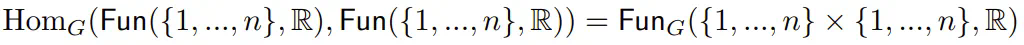 ,并且 G = S_n 有两条由对角及其补集(complement)给出的轨道。因此,存在一个二维的等变映射空间 n→n,并且这与 n 无关。(在机器学习领域,这种形式的 S_n 的等变神经网络也被称为深度网络。)