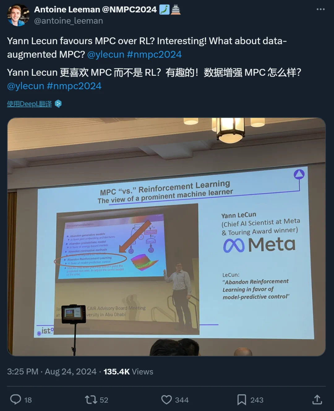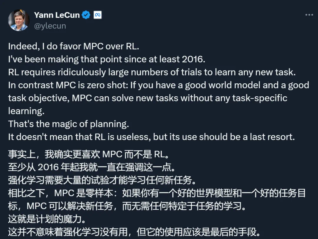 同时,LeCun 也指出,相比于强化学习,他更倾向于 MPC(模型预测控制)。