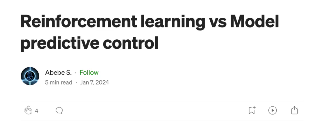 在前面的讨论中,有网友推荐了一篇 Medium 文章,分析对比了强化学习与 MPC。