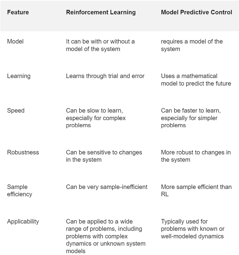 下表列出了强化学习和 MPC 在模型、学习方法、速度、稳健性、样本效率、适用场景等方面的区别。一般来说,对于难以建模或具有复杂动态的问题,强化学习是合适的选择。对于建模良好且动态可预测的问题,MPC 是一个不错的选择。