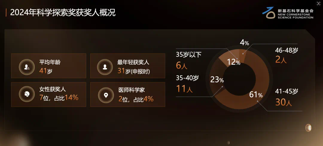随着新一届获奖名单揭晓,科学探索奖 6 年来共资助 297 位青年科学家。根据数据统计,今年获奖年龄平均 41 岁,女性获奖人数大幅增加,有 7 位,去年 3 位。