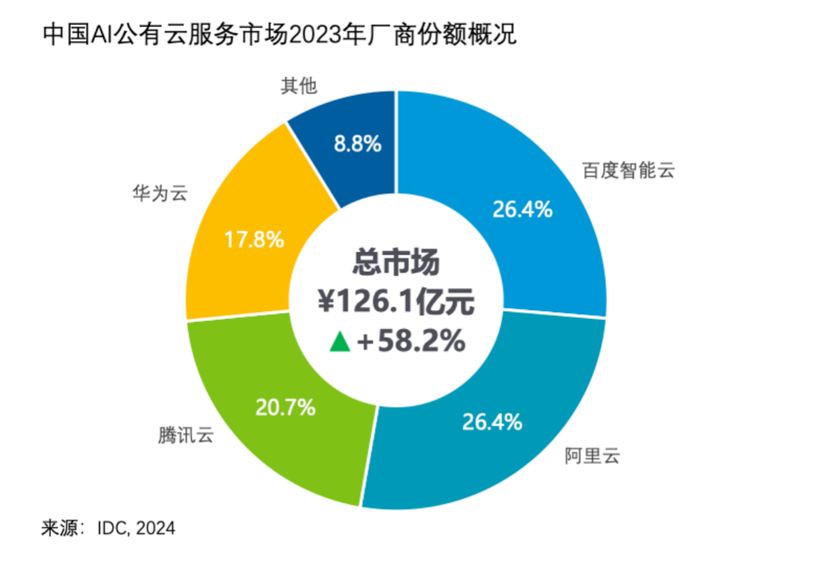 近日,全球领先的IT市场研究和咨询公司IDC 发布《中国人工智能公有云服务市场份额,2023》报告。报告显示,2023年中国AI公有云服务市场整体规模达126.1亿元人民币,百度智能云市场份额排名第一(26.4%),自IDC发布中国AI公有云市场报告以来,百度智能云已经连续5年蝉联中国市场第一。