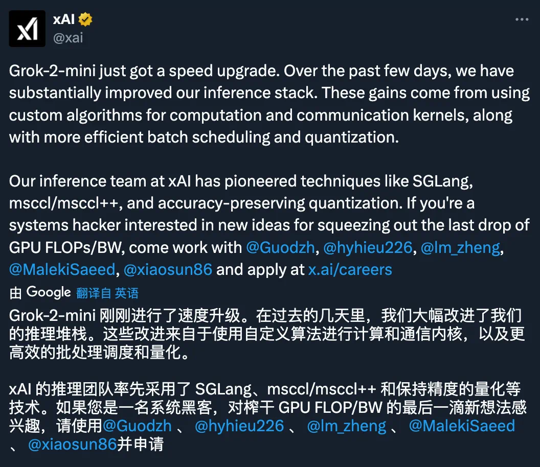 文章来源于互联网:三个程序员奋战三天重写推理堆栈,Grok-2 mini直接提速两倍,马斯克亲发贺电