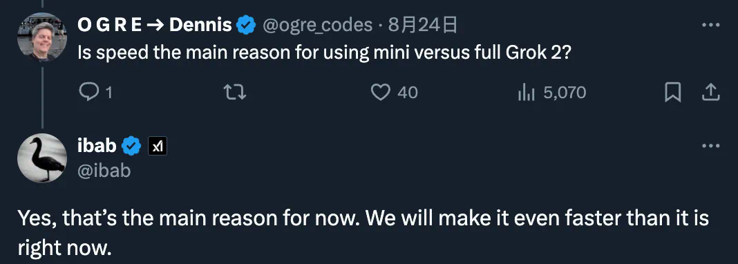 用户的感觉也不是错觉,Grok-2 的两个版本 Grok-2 和 Grok-2 mini(后者功能更弱但速度更快),确实都提高了分析信息和输出回复的速度。