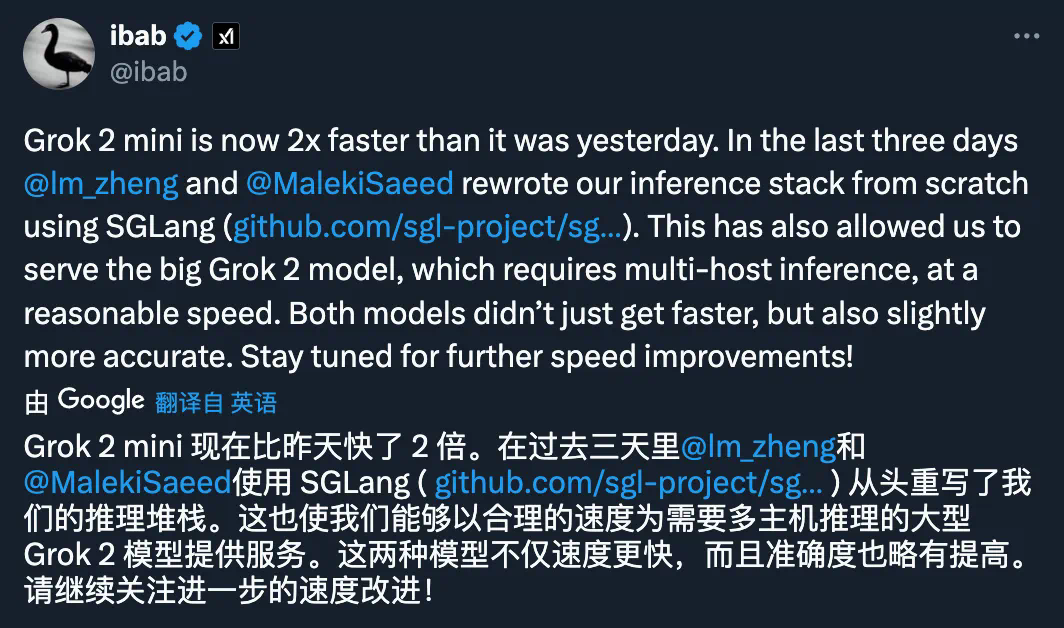 正如这条动态所说,他和 xAI 的另外两名开发人员 Lianmin Zheng 和 Saeed Maleki 奋战了三天,用 SGLang 重写了推理技术栈。