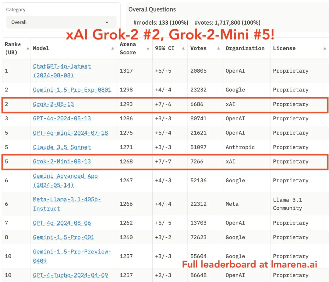 这次奋战的结果很理想:在评价人工智能模型性能的第三方 Lmsys Chatbot Arena 排行榜更新中,Grok-2 主模型在 6686 次投票中获得了 1293 分的成绩。这使得 Grok-2 成为世界上最强人工智能模型中的第二名,与谷歌的 Gemini-1.5 Pro 模型并列,仅次于 OpenAI 的最新版本 ChatGPT-4o,且超越了 GPT-4o(2024 年 5 月)。