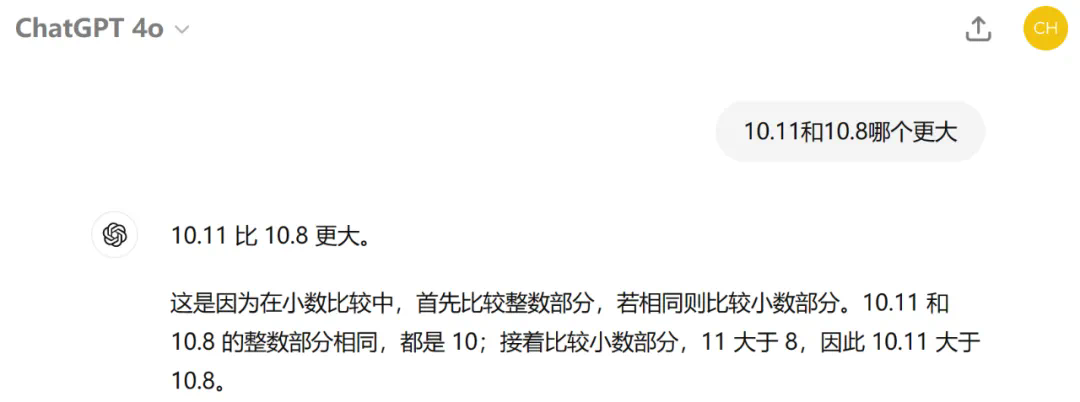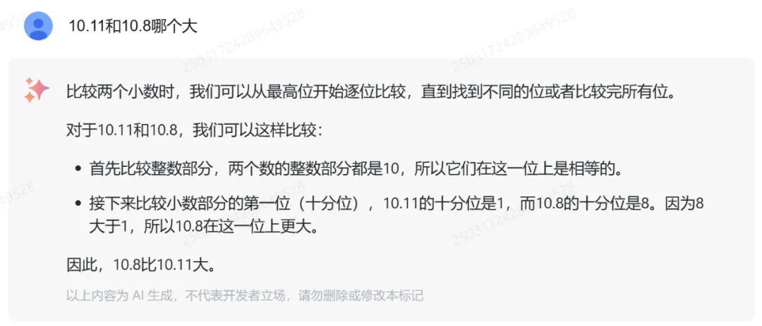 类似的数字比较同样答对了。从解题思路来看,GLM-4-Flash 掌握了正确的小数位比较方法。