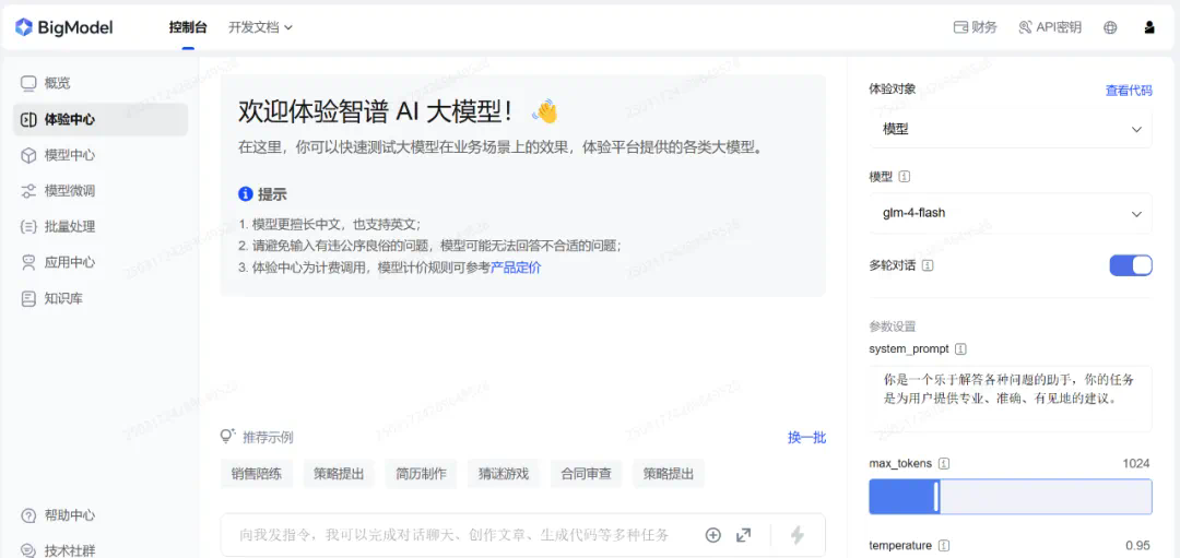 此外,用户也可以自由调整 GLM-4-Flash 对话窗口的最大 tokens 数量(输入上下文长度)、模型温度(控制生成的随机性和创造性)、top_p(控制回答风格,保证输出结果正确性的同时增加多样性)。