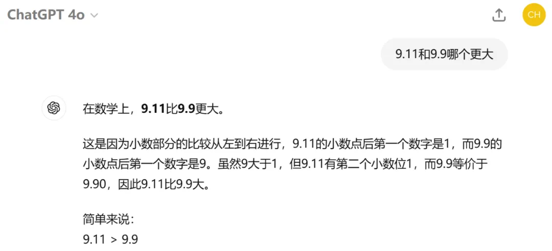 测试 1:先来一道前段时间让很多大模型翻车的「9.11 和 9.9 哪个更大」问题,很容易就答对了。