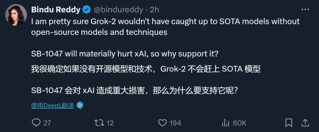 在反对声浪如此高涨的当下,马斯克的态度多少有点出人意料。毕竟一旦法案通过,他创建的 xAI 所训练的 Grok 系列模型也会被纳入监管范围,而且研发进度也可能受到影响。