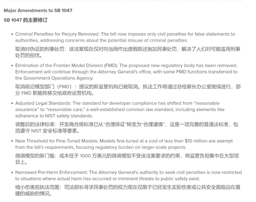 其实,在 OpenAI 发布公开信之前,SB 1047 已经经过了一番修改,以安抚科技公司,主要修订如下: