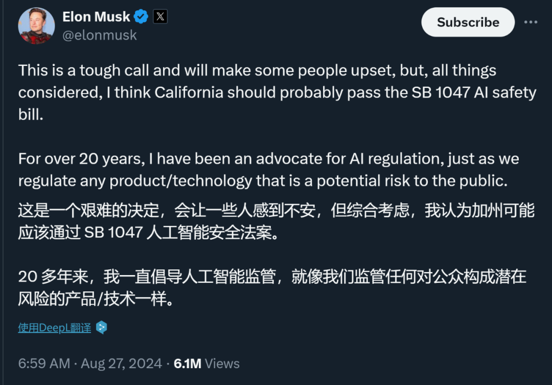 「这是一个艰难的决定,会让一些人感到不安。但是,综合考虑所有因素,我认为加州或许应该通过 SB 1047 人工智能安全法案。二十多年来,我一直是人工智能监管的倡导者,正如我们对任何对公众存在潜在风险的产品 / 技术进行监管一样。」刚刚,马斯克发了这样一则推文。