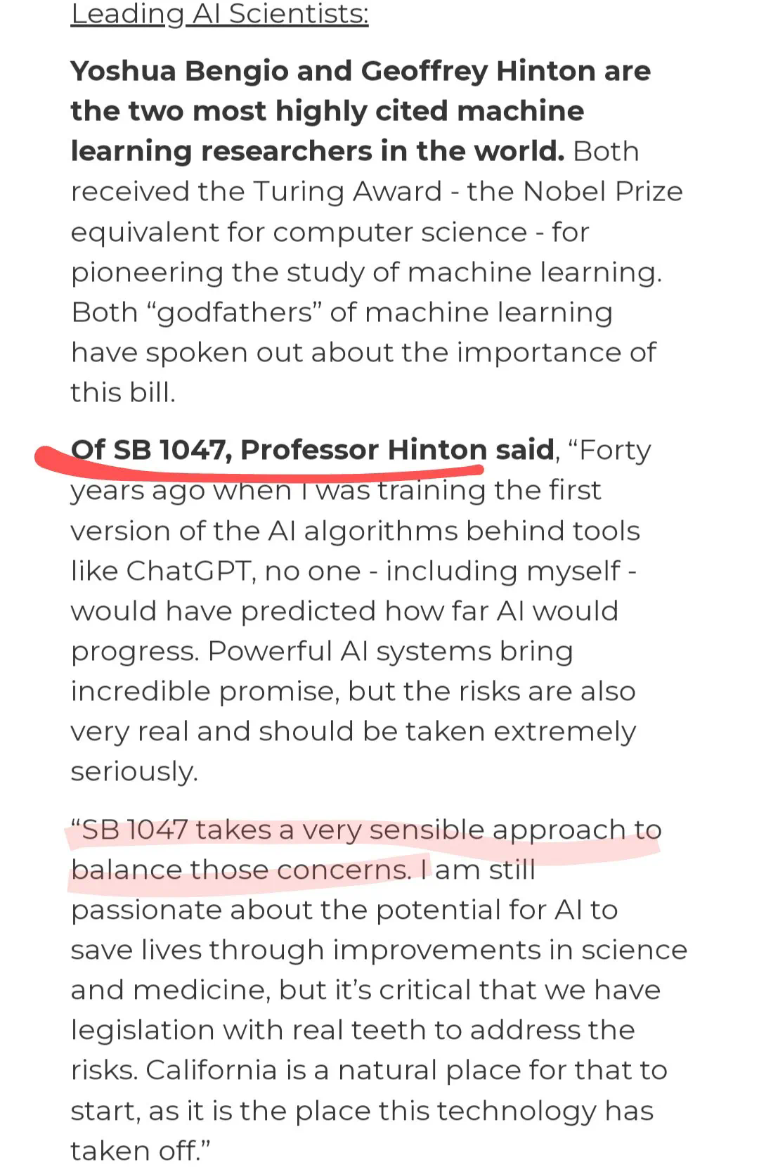 除了 Anthropic 和马斯克,SB 1047 还获得了包括 Geoffrey Hinton 和 Yoshua Bengio 在内的知名人工智能研究人员的支持,他们强调了平衡创新与安全的重要性。Hinton 称赞该法案方法合理,强调了需要有针对强大人工智能系统风险的立法。
