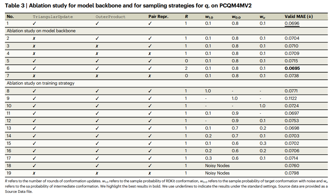 研究人员将对 Uni-Mol+ 进行了全面的消融研究。对 PCQM4Mv2 数据集进行了消融研究,采用默认的 12 层 Uni-Mol+ 配置。研究结果总结在表 3 中,其中 No.1 是默认设置,No.2–7 重点检查模型主干,No. 8–No. 17 重点检查训练策略。