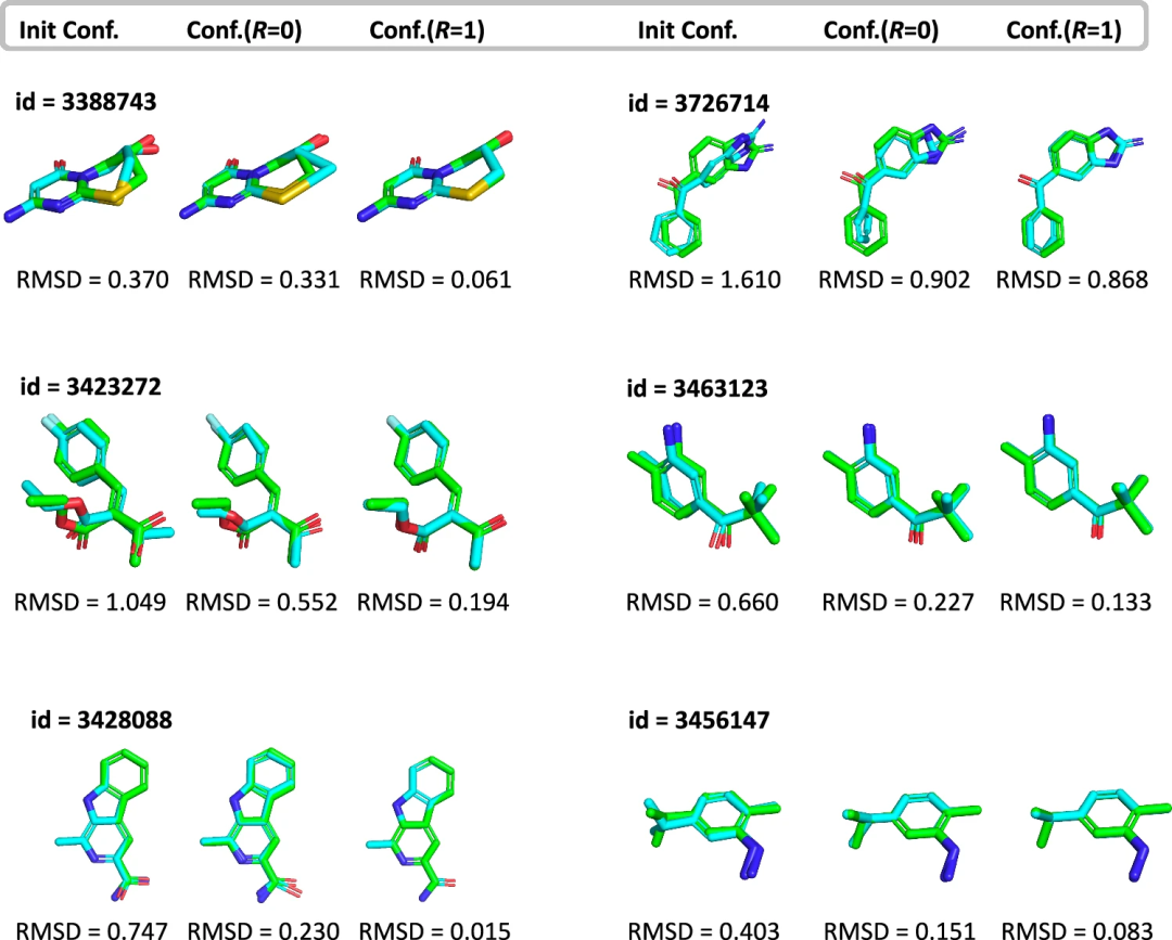 为了学习构象更新过程,研究人员提出了一种新颖的训练策略。从 RDKit 生成的原始构象和 DFT 平衡构象之间的轨迹中采样构象,并使用采样的构象作为输入来预测平衡构象。必须注意的是,在许多数据集中,实际轨迹通常是未知的;因此,研究人员使用一种假定两个构象之间存在线性过程的伪轨迹。