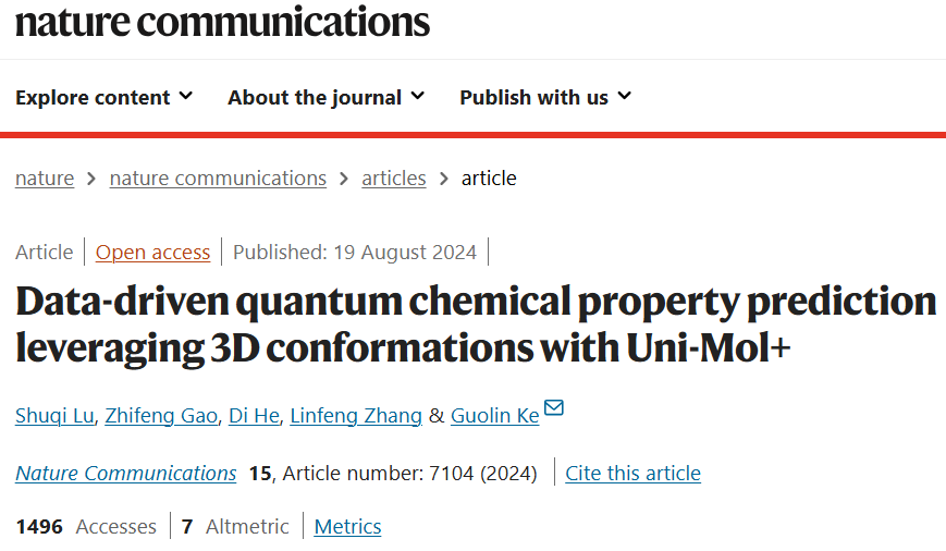 相关研究以「Data-driven quantum chemical property prediction leveraging 3D conformations with Uni-Mol+」为题,于 8 月 19 日发布在《Nature Communications》上。