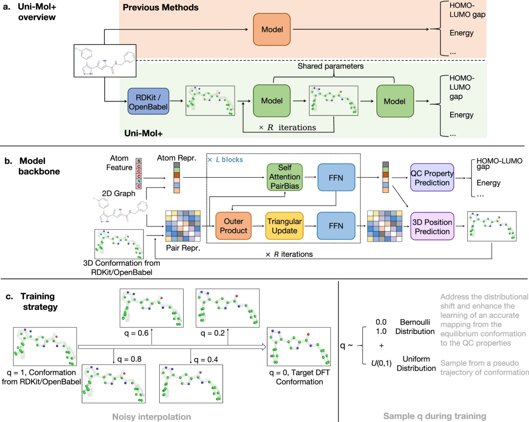 对于任何分子,Uni-Mol+ 首先通过廉价方法(例如来自 RDKit 和 OpenBabel 的基于模板的方法)获得原始 3D 构象。然后,它通过原始构象的迭代更新过程学习目标构象,即由 DFT 优化的平衡构象。在最后一步中,根据学习到的构象预测 QC 属性。