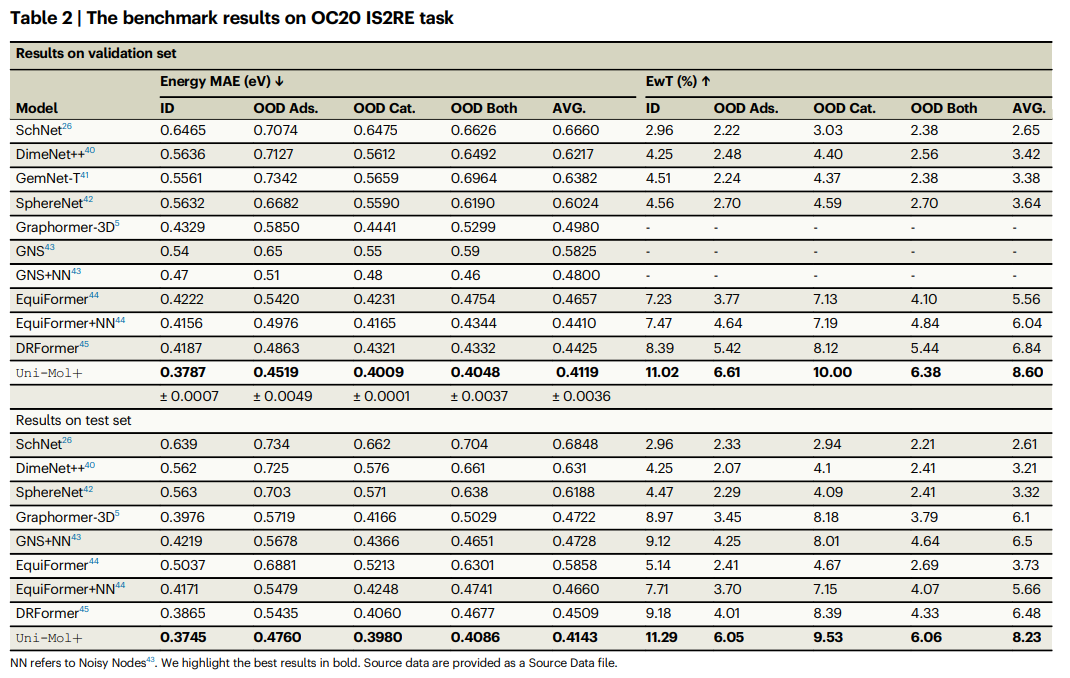 研究人员对 OC20 IS2RE 验证和测试集上的各种模型进行了性能比较,如表 2 所示。从表中可以看出,Uni-Mol+ 在平均绝对误差 (MAE) 和阈值内能量 (EwT) 方面都明显优于所有之前的基线。这证明了 Uni-Mol+ 的卓越性能。研究结果强调了 Uni-Mol+ 在捕捉材料系统中复杂相互作用方面的有效性,以及它在各种计算材料科学任务中广泛应用的潜力。