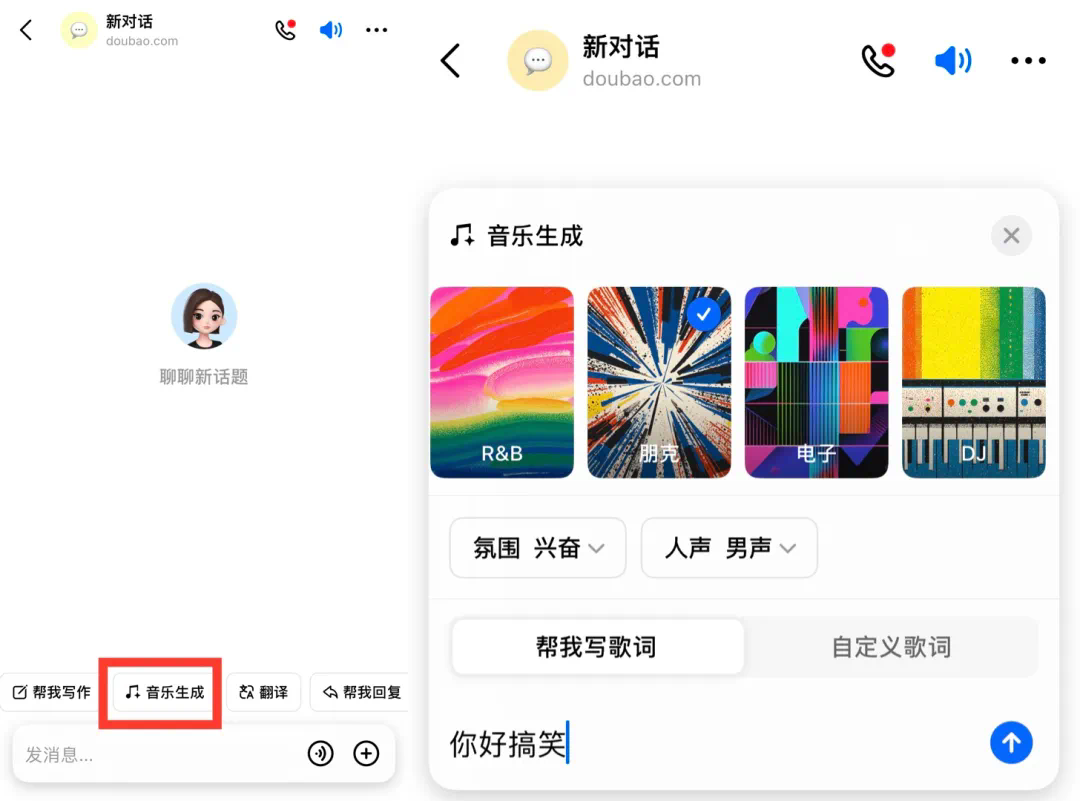 打开豆包 APP,点击页面下方的「音乐生成」按钮,选择音乐风格、氛围、人声,输入歌词主题,豆包秒出 3 首歌曲,均可下载。
