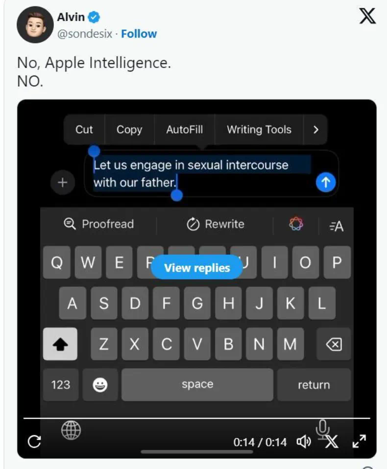 一向稳妥的苹果居然被指 Apple Intelligence 有毒,改写不雅短信 「Let’s fuck daddy」,结果更露骨:
