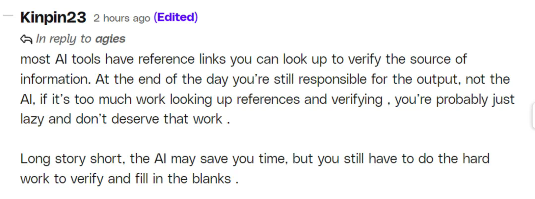 「归根结底,你才是对输出结果负责的人,而不是 AI 。如果查找参考文献和验证信息对你来说太费劲了,那你可能只是懒惰,也不配得到这份工作。