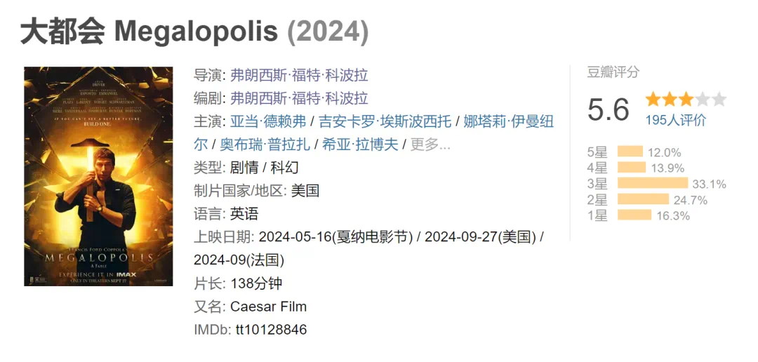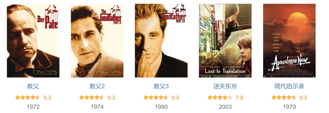 科波拉代表作《教父》系列、《现代启示录》的豆瓣评分相当高。