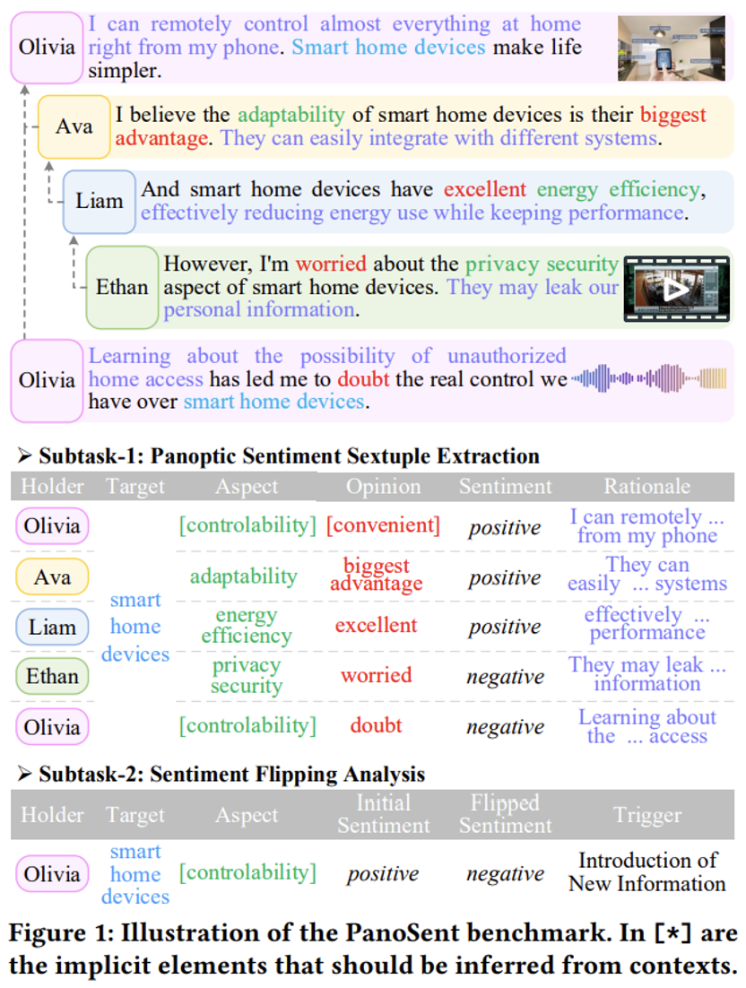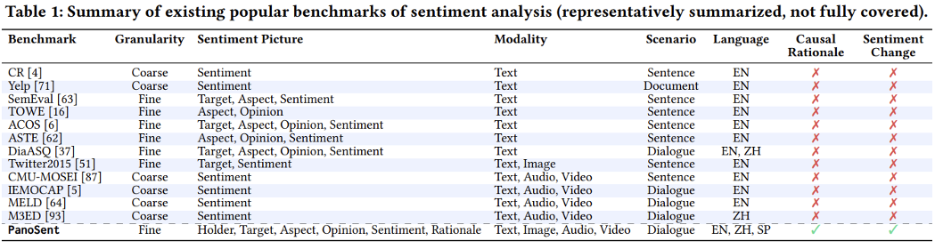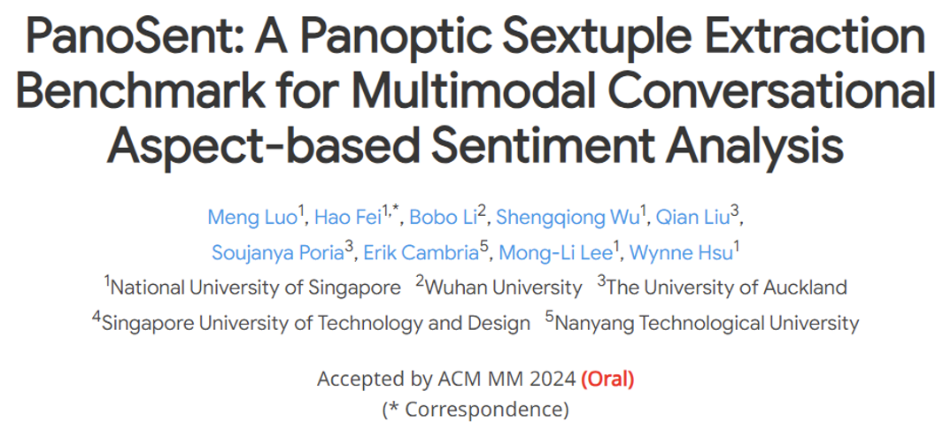 新加坡国立大学联合武汉大学、奥克兰大学、新加坡科技设计大学、南洋理工大学团队近期在这个方向上迈出了重要的一步,探索了情感分析的终极形态,提出了 PanoSent —— 一个全景式细粒度多模态对话情感分析基准。PanoSent 覆盖了全面的细粒度、多模态、丰富场景和认知导向的情感分析任务,将为情感计算方向开辟新的篇章,并引领未来的研究方向。该工作被 ACM MM 2024 录用为 Oral paper。