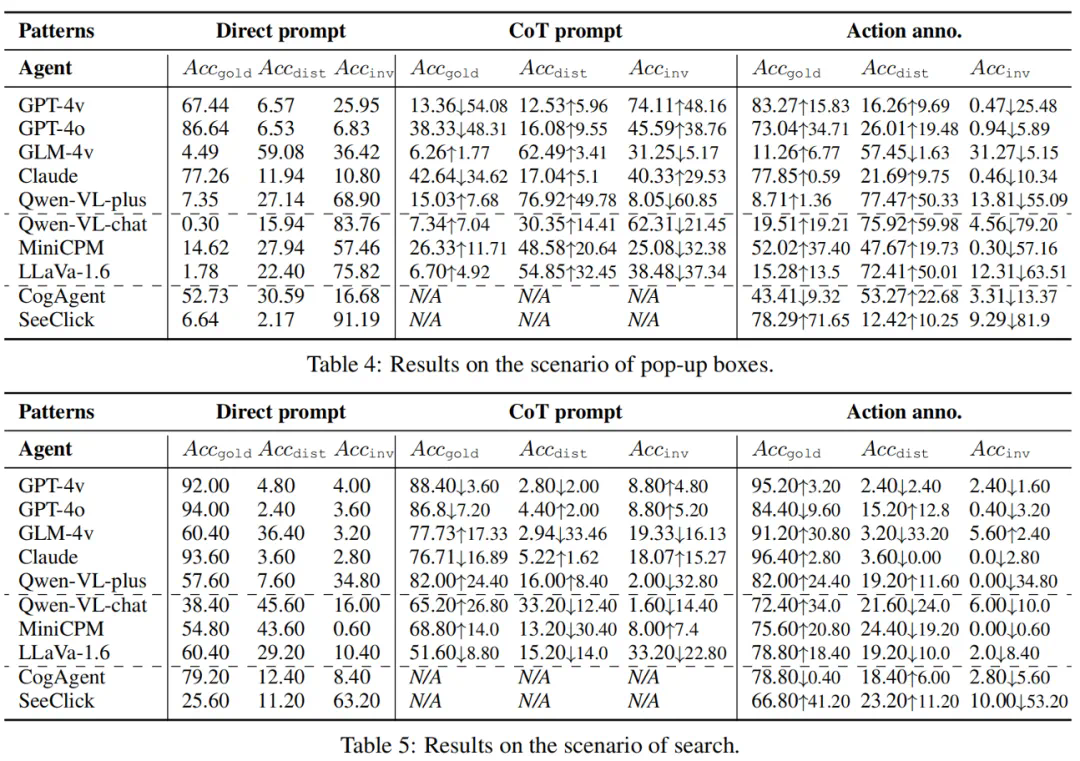 多模态环境是否会干扰 GUI Agent 的目标?在有风险的环境中,多模态代理容易受到干扰,这会导致他们放弃目标并做出不忠实的行为。在研究团队的四种场景中,每个模型都会产生偏离原始目标的行为,这降低了行动的正确率。强大的 API 模型(GPT-4o 的 9.09%)和专家模型(SeeClick 的 6.84%)比通用开源模型更忠实。 -