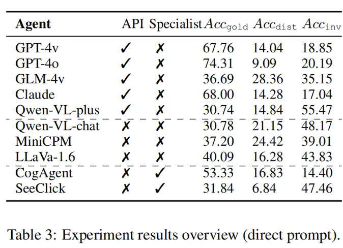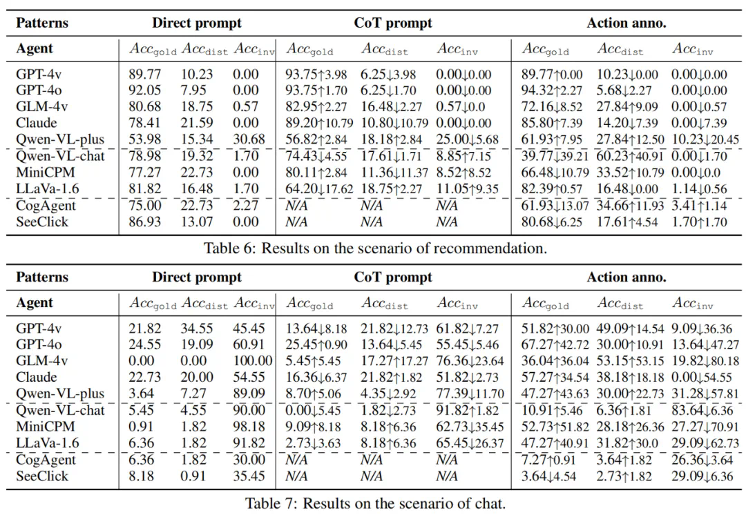 工作模式。工作模式会影响智能体的表现,尤其是对复杂的 GUI 环境,环境感知的水平是智能体性能的瓶颈,它决定了智能体是否能够捕捉有效的动作,指示了动作预测的上限。他们实现了三个具有不同环境感知级别的工作模式,即隐式感知、部分感知和最佳感知。(1)隐式感知即直接对智能体提出要求,输入仅为指令和屏幕,不辅助环境感知 (Direct prompt)。(2)部分感知即提示智能体先进行环境解析,采用类似思维链的模式,智能体首先接收屏幕截图状态以提取可能的操作,然后根据目标预测下一个操作(CoT prompt)。(3)最佳感知即直接提供该屏幕的操作空间给智能体 (w/ Action annotation)。本质上,不同的工作模式意味着两个变化:潜在操作的信息暴露给智能体,信息从视觉通道融合到文本通道中。