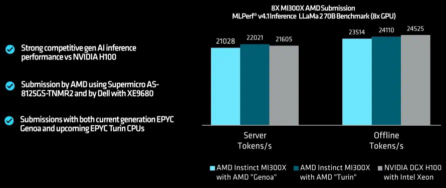 AMD 的数据直到上周才发布。业内有传言说 AMD 签了一些大订单,会把 MI300X 出售给超大规模计算公司和云构建商,以支撑他们的推理工作负载。无怪乎 AMD 直到上周才发布 MLPerf Inference v4.1 测试结果。