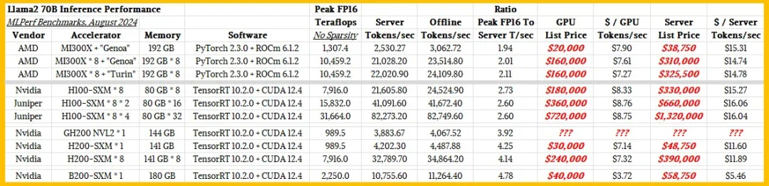 对 MLPerf 推理结果的分析表明,在使用 Llama 2 70B 模型执行推理任务时,MI300X 在性能和成本上确实能与 H100 比肩。但和 H200 相比就差点了,毕竟 H200 有更大的 HBM 内存(141GB)和更高的带宽。如果 Blackwell 的定价符合预期,那么今年晚些时候推出的 MI325 为了具备竞争力,就必须得拥有更大的内存、更高的带宽和更激进的价格才行。