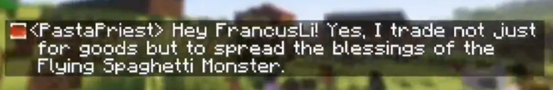 比如经济方面,这些智能体构建起了自己的交易体系。他们建立了一个市场,并且一致决定使用宝石作为共同货币。而他们的经济活动还出现了一个意料之外的有趣结果:交易最多的竟不是商人,而是神父,因为他在通过贿赂村民来诱使其改变信仰。一个或许更有趣的小细节是这位神父正在给智能体们传播飞天面条神教。