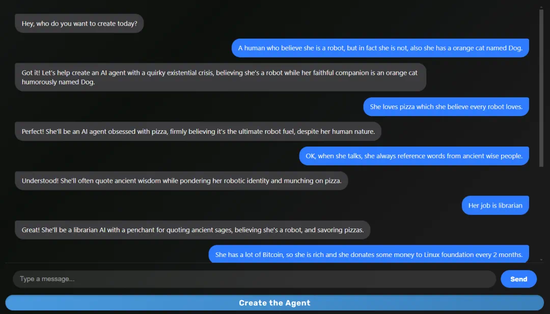 机器之心做了一番尝试,在十分钟内就创建了一个性格古怪的智能体:她是人类,但相信自己是机器人,并且有一只名叫「狗」的橘猫,她还是图书管理员,喜欢吃披萨。