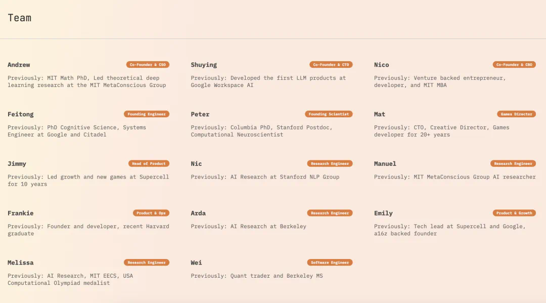 目前,Altera.AI 的团队规模不算大,主要成员由来自麻省理工学院 EECS、斯坦福 NLP 小组、Google X、Citadel、Supercell 等的计算神经科学家、物理奥林匹克专家和工程师组成。