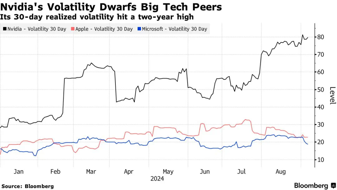 对于这家价值 2.5 万亿美元的巨头来说,这些跌幅也向投资者展示了一个更为紧迫的问题:它的波动性现在远远超过了谷歌、苹果、微软、Meta 等美股六巨头,甚至让上蹿下跳的比特币,都显得平静了许多。