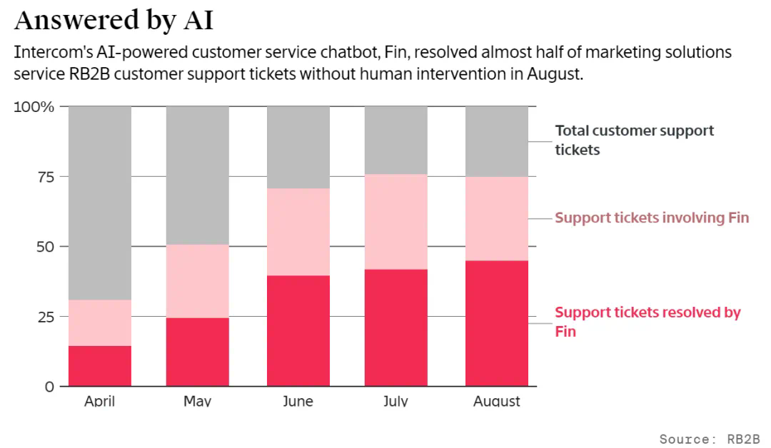 据管理该业务的 Robb Clarke 介绍,使用 Fin 机器人的一家公司到目前为止似乎很满意。Fin 聊天机器人在八月处理了 948 个工单中的 60% 问题。Clarke 估计,鉴于人工解决一个工单平均需要 15 分钟,Fin 在八月为两人小团队节省了 142 小时的工作时间。该公司每解决一个工单支付 99 美分,相比之下,人工解决一个工单的成本约为 10 美元。