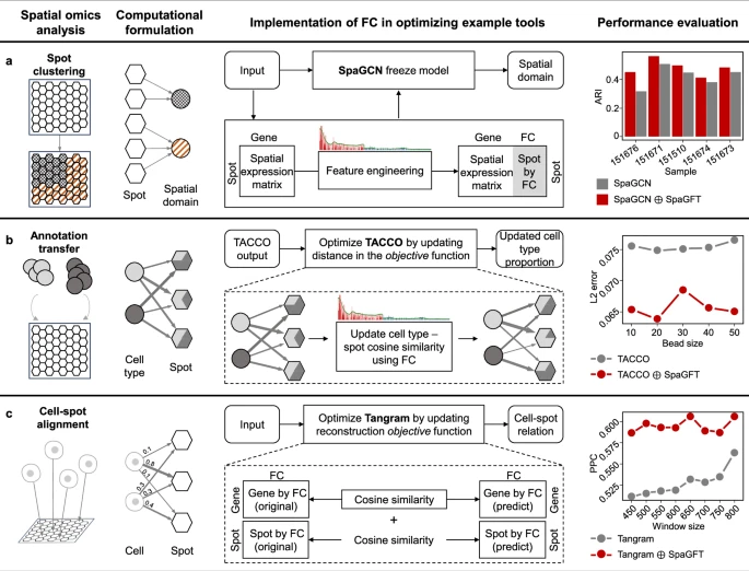 图示 :SpaGFT 针对三个以细胞为中心的工具实现,该图由四列组成,每列对应空间组学分析、计算公式、优化示例工具中的 FC 实现以及性能评估。(来源:论文)