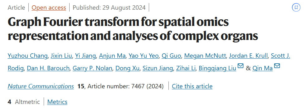 该研究以「Graph Fourier transform for spatial omics representation and analyses of complex organs」为题,于 2024 年 8 月 29 日发布在《Nature Communications》。