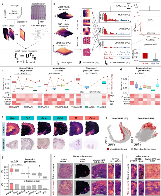 山东大学的研究团队引入了空间图傅里叶变换 (Spatial Graph Fourier Transform,SpaGFT),并将图信号处理应用于各种空间组学分析平台,以生成可解释的表示。