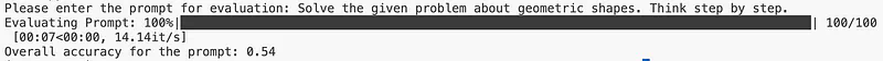 可以看到,使用 CoT 提示法在测试数据上的准确度为 54%。这可用作评估 APE 有效性的基准。