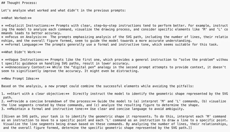 了解优化器尝试构建新提示词的「思考过程」是一件很有趣的事。正如元提示词指示的那样,它会分析之前的结果并识别模式: