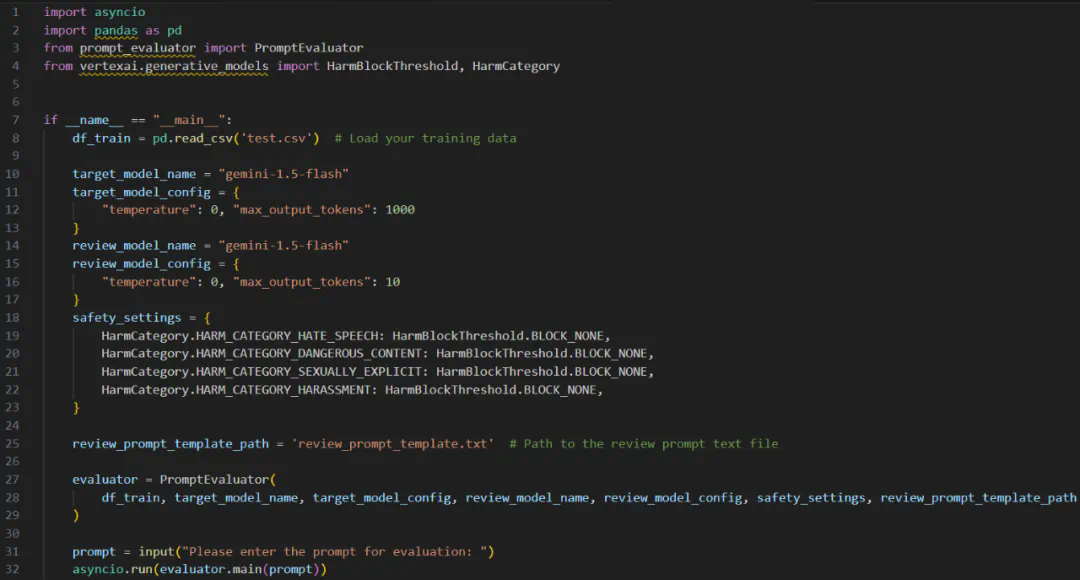首先,评估目标 LLM 在训练数据上的表现 —— 这些数据将用于引导提示词优化过程。这能提供一个比较基准,并凸显对提示词优化的需求。下面是使用 Vertex AI 和 Gemini 1.5-flash 模型运行此基线评估的 Python 代码: