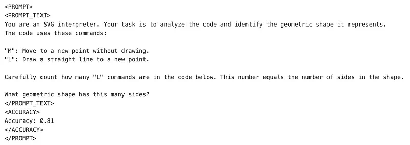 81%,大幅提升!并且这个新的提示词可说是相当具有创造力:它提出了计算 SVG 路径中有多少个「L」命令的想法,并将其用于指示绘制了哪个形状!