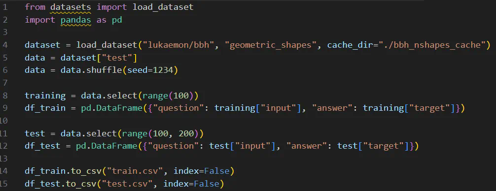 这段代码执行的任务是加载 geometric_shapes 数据集,然后执行随机混洗(使用了一个固定的种子,以便后面复现),然后选择前 100 个样本用于训练,接下来的 100 个样本用于测试。最后将它们分别保存为 CSV 文件。准备好数据之后,就已经准备好下一步了:创建基线。