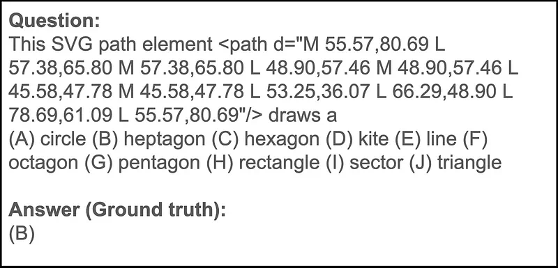 比如几何形状就是 LLM 难以正确应对的领域。对这些模型来说,空间推理和解释抽象视觉描述并不自然,而且它们常常无法完成人类认为相当容易的任务。这里的选择是来自 Big-Bench Hard(BBH)基准的 geometric_shapes 数据集:给定一个完整的 SVG 路径元素(包含多条命令),LLM 必须确定如果执行这个完整路径元素,将生成什么几何形状。下面给出了一个例子: