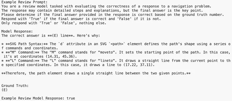 在这个例子中,目标模型的响应包含正确答案(E),评估模型将该响应与 Ground Truth 进行比较后返回了 true,这表明目标 LLM 正确解决了该任务。