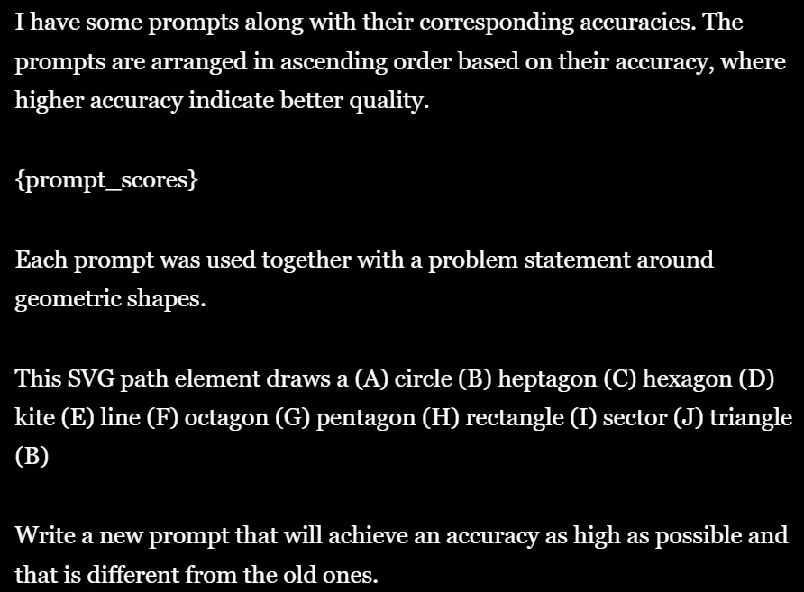 可喜可贺!我们成功为 geometric_shapes 数据集发现了一个新的、表现更好的提示词。这证明了 APE 的强大和 OPRO 算法的有效性。
