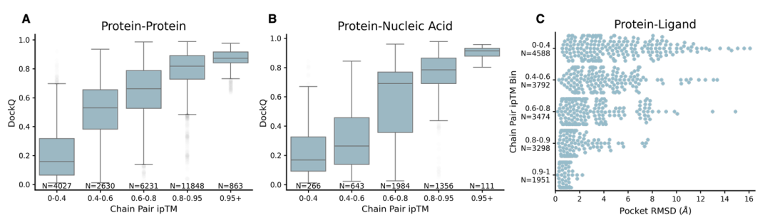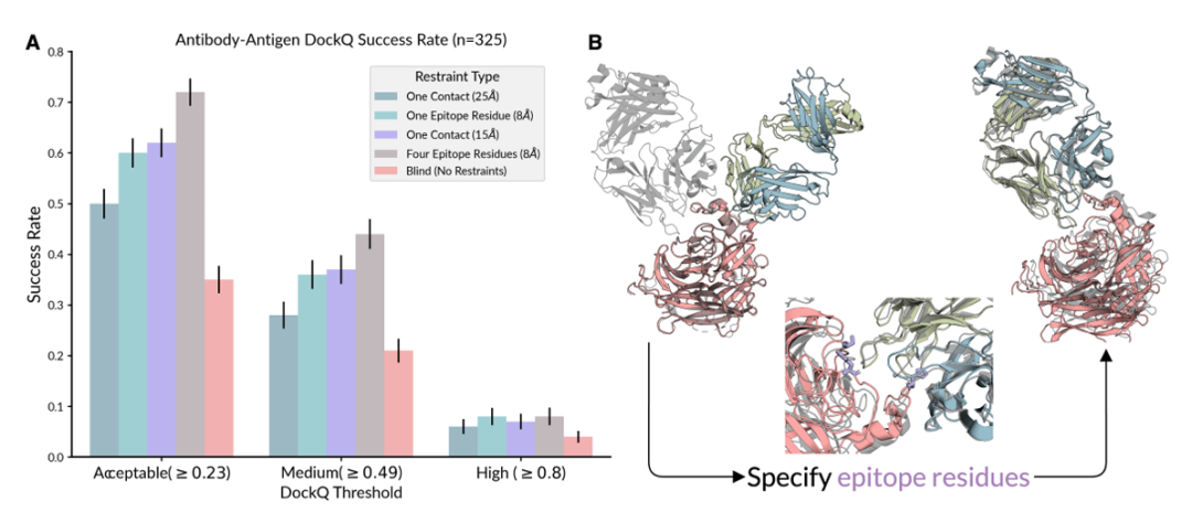 研究人员在技术报告中探讨了许多这样的能力,例如表位调节 – 即使使用少量接触或口袋残基(可能来自实验室实验)也可以使抗体-抗原结构预测准确度翻倍,从而使使用 AI 进行抗体工程变得更加可行。