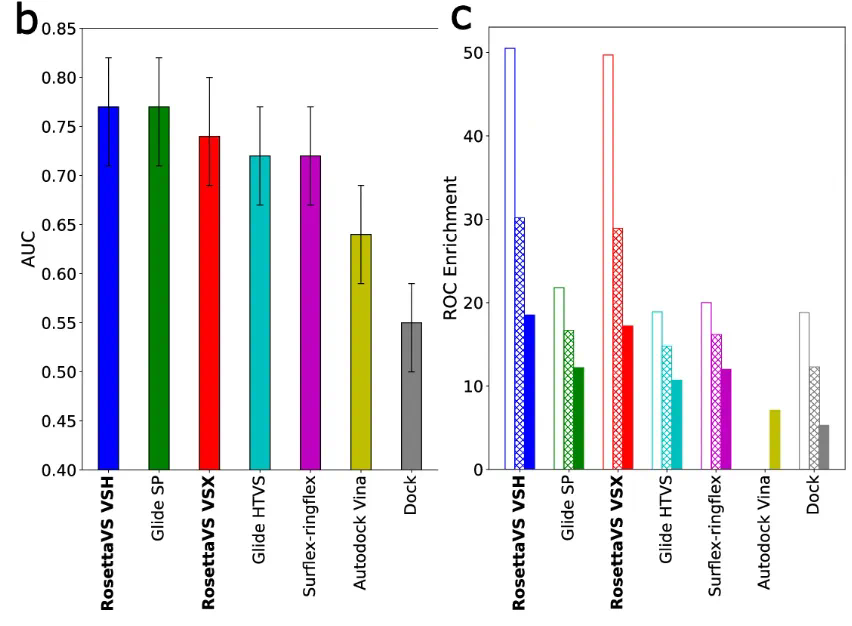 就受试者工作特征 (ROC) 曲线富集和 ROC 曲线下面积 (AUC) 而言,结果表明 RosettaVS 为领先的虚拟筛选方法。